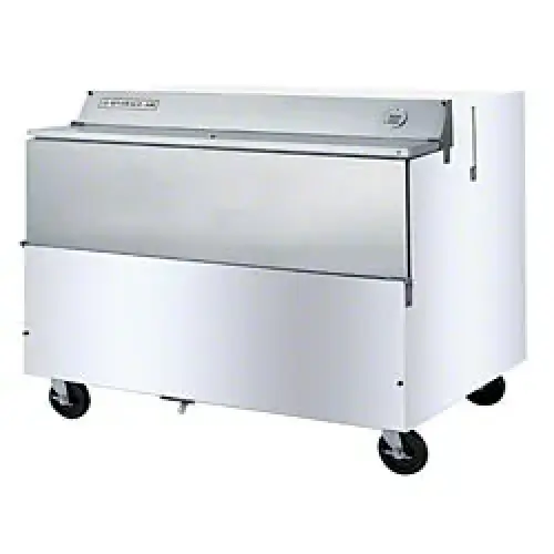 A forced-air milk cooler keeps milk appropriately chilled during serving. This Stainless Steel 49" Single Access Forced-Air Milk Cooler (Beverage Air STF49Y-1-W) is ready for your school’s restaurant department. The unit is easy to push around on its included heavy-duty casters. Your milk cartons will always be cool because of the balanced, forced-air refrigeration system and dual evaporator. A cold-air blanket will always go over your milk to ensure that each carton is drinkable and less than 36-38° F. This unit is a simple to clean with its centrally located floor drain that connects to drain hose with hose adapter. This milk cooler comes pre wired and with an 8’ long cord and plug set. This items carton capacity is 576.