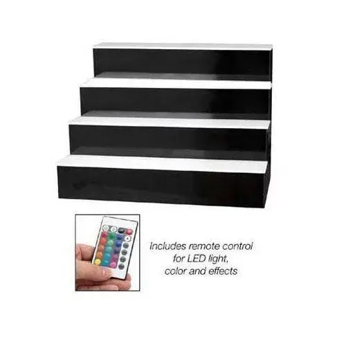 4" deep steps hold most liquor bottles 750ml and smaller. Translucent acrylic steps change color with included IR remote control. Lighting adjusts to one of 16 programmable colors, strobes, smooth transitions and gradual fades. 30" x 16" x 20". Black face color.