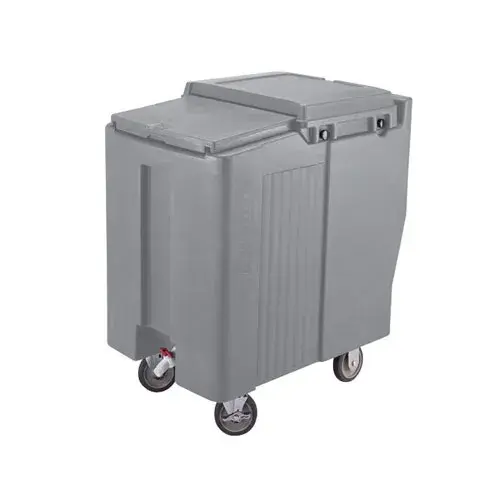 This Cambro ICS125LB-191 - 125 lb. Capacity - Sliding Lid Portable Ice Bin - Grey is perfect for storing large amounts of ice over a long period of time. There is a built in drain shelf which separates water and ice to prevent the ice from melting as fast. The caddy itself is made with polyethylene plastic (extremely durable and resistant) and has thick foam insulation on the inside. The lid slides open instead of detaching which means there's no need to set it down somewhere and increase the chance of contamination. On the bottom there are four casters, two of which are swiveling and the other two are fixed with brakes.