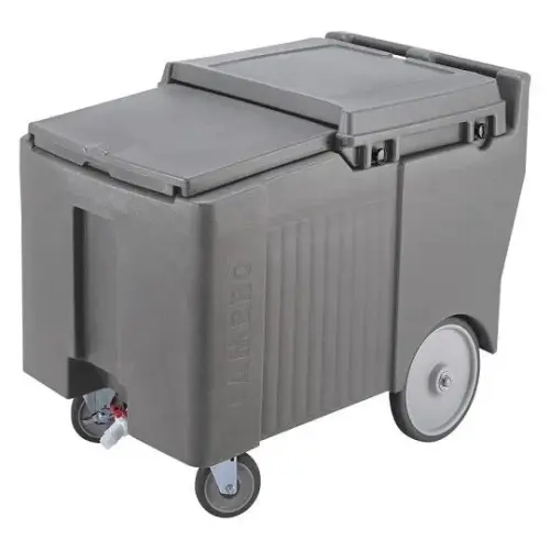 This Cambro ICS175L-401 - 175 lb. Capacity - Sliding Lid Portable Ice Bin - Blue is perfect for storing large amounts of ice over a long period of time. There is a built in drain shelf which separates water and ice to prevent the ice from melting as fast. The caddy itself is made with polyethylene plastic (extremely durable and resistant) and has thick foam insulation on the inside. The lid slides open instead of detaching which means there's no need to set it down somewhere and increase the chance of contamination. On the bottom there are four casters, two of which are swiveling and the other two are fixed with brakes.