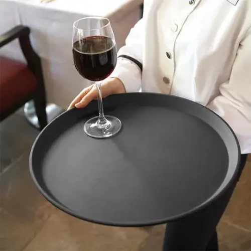 This Cambro Camtread Non-Skid Fiberglass Serving Tray [1800CT-138] is a great addition to any restaurant or bar. This tray is made using lightweight, high-impact fiberglass. This means it's tough and takes scratches or bumps easily while still remaining lightweight. The diameter of this tray also makes it easy to hold plenty of drinks or food. The shape of the tray makes the tray itself easy to hold as well. Comes in a set of 12.