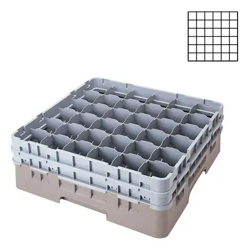 This Cambro 2.875" Stemware & Tumbler Glass Rack - Camrack [36S1114-167] is a dish rack for cups with 36 compartments. Each compartment can hold a cup with a max diameter size of 2.875 inches and a max height of 11.75 inches. This square shaped cup rack fits in most commercial dish washers and makes cleaning cups and other glassware extremely easy. Thanks to the polypropylene plastic used in this construction, this cup rack is extremely durable and heat resistant. Comes in a set of 2.