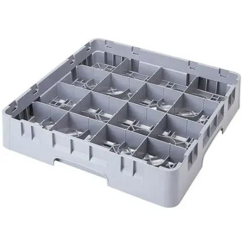This Cambro 4.375" Stemware & Tumbler Glass Rack - Camrack [16S738-168] is a dish rack for cups with 16 compartments. Each compartment can hold a cup with a max diameter size of 4.375 inches and a max height of 7.75 inches. This square shaped cup rack fits in most commercial dish washers and makes cleaning cups and other glassware extremely easy. Thanks to the polypropylene plastic used in this construction, this cup rack is extremely durable and heat resistant. Comes in a set of 3.
