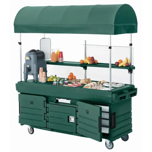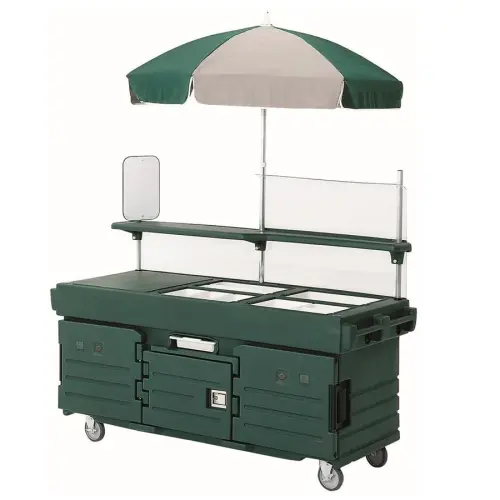 This Cambro CamKiosk Vending Cart [KVC854-191] is an excellent way to display products and attract customers. On top it has plenty of display space and down under it has plenty of storage space. The full size food pan wells offer plenty of storage space. The casters secured at the bottom of this unit makes the unit incredibly easy to transport from one location to another.