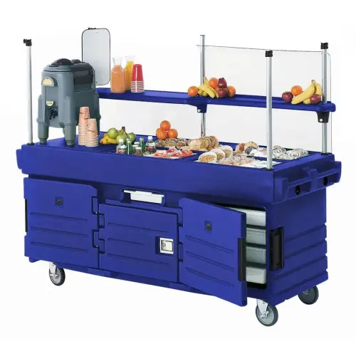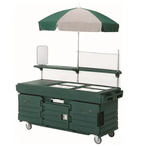 This Cambro CamKiosk Vending Cart [KVC856-191] is an excellent way to display products and attract customers. On top it has plenty of display space and down under it has plenty of storage space. The full size food pan wells offer plenty of storage space. The casters secured at the bottom of this unit makes the unit incredibly easy to transport from one location to another.