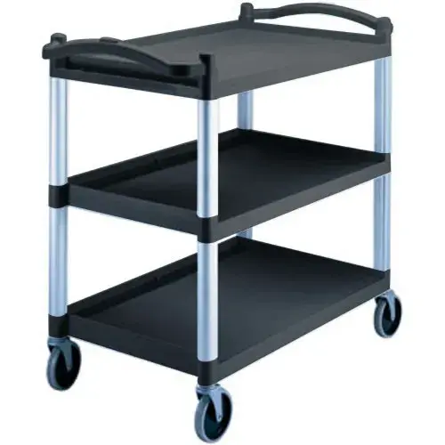 This Cambro Black Three Shelf Utility Cart [BC340KDL8-110] is a lightweight and easy to assemble utility cart. This cart has a large max capacity of 400 lbs and has several shelves for storage and transport. This multi-purpose cart is perfectly stable and mobile thanks to the reliable casters attached on the bottom. Whether it's for customer service or for collecting refuse, this cart is perfect for any job. Comes in a set of 12.