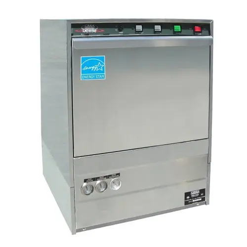 Conserving energy has become a key money-saving strategy in every aspect of a commercial kitchen. Fortunately, models like the ENERGY STAR Qualified 30 Rack/Hr Undercounter Dishwasher (UC65e) from CMA Dishmachines which uses less than a gallon of fresh water per cycle make saving energy easy. The unit also uses high temperature water during the rinse phase which, though it does not sound like it, can actually save money in the long run because high temperature rinse water does a better job of cleaning dishes the first time than chemical sanitizing units. Features Fully automatic cycle Stainless steel construction Counter-balanced double skin door Built-in detergent and rinse additive pumps One peg and one flat-bottom dishrack included 30 racks / 120 covers per hour 0.8 gallons water usage per rack Benefits Pump drain allows for multiple installation applications, including elevated drains Safety Temp feature assures 180°F rinse water for proper sanitization Door safety switch turns machine off when door opens mid-wash, for user safety Additional Considerations Water requirements: Water temperature: 140°F Water connection: 1/2” Drain connection: 3/4” Contact a FSW Sales Specialist for information about available options, including: Alternative electrical options