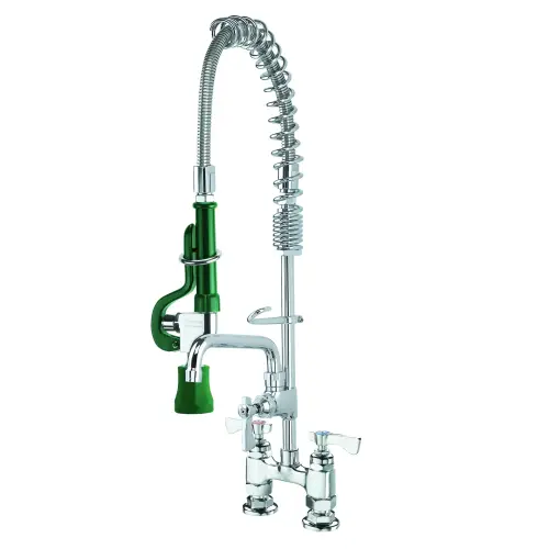 This Krowne 18-406L - Royal Series Deck Mount Space Saver Pre-Rinse with Add-On Faucet is simple and classic in design. It has been constructed out of high quality steel. Made using advanced welding techniques, this sink faucet is a one-piece, seamless faucet unit with with a hot and cold nob to release water. There are two nobs one on the left side of the faucet and one on the right. This sink faucet is perfect for any sink and is generally used for commercial sinks. This item will prove to be a great investment for your food service establishment.