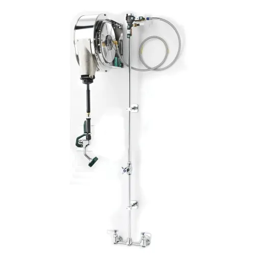 Krowne Royal Series Pre-Rinse Hose Reel Assembly, Enclosed Stainless Steel w/ 8" Center Faucet, Designed to Run Water Feed Outside Wall, 57-1/2" Overall Height, Faucet May Be Wall or Deck Mounted, Replaces T&S Brass* B-1433. This item does not require low lead compliance because it is not intended to dispense water for human consumption. Ideal for pre-rinsing, pot filling, misting produce and general cleaning. Provides water quickly and conveniently to all kitchen areas. Universal mounting allows for fast installation, can be either ceiling, floor or wall mounted. Positive latching operation ensures hose will hold at desired length. Heavy-Duty specially designed retrieval springs allow for easy hose recoil. Available in stainless steel or durable gray powder coated finishes. Furnished with ergonomically designed insulated spray valve handle control, which offers variable water velocity. Each valve handle furnished with non-marring high impact resistant bumper. Heavy-Duty hose tested to 210°F (99°C) and 250 psi (18 BAR). Furnished with stainless steel spring hose guard for extended hose life. Full four year warranty. Full 35 foot hose capacity. Popular 3/8” inlet fittings. Elite Restaurant Equipment ensures that this product, 24502, is easy to use and install.