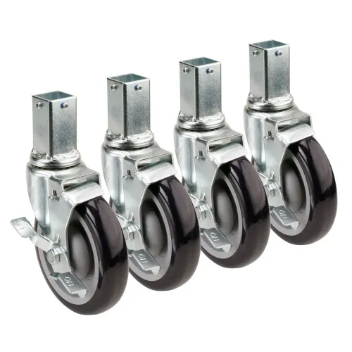 Krowne 1" Square Post Shelving Caster, Locking Wheels, 5" Diameter, Set, (4 Pieces per Set). Fits 1" square shelving posts.. Set of 4. Fits 1" square shelving posts. 2 allen screws fasten each caster to post. 5" wheel. Load capacity 220 lbs. per caster. 4 pcs per set, 6 sets per case. Grease resistant wheel. Overall Height 6". Elite Restaurant Equipment ensures that this product, 28172S, is easy to use and install.
