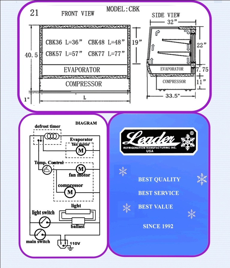 The Leader Refrigeration CBK48SC bakery display case includes a balanced refrigeration system. It is programmed to keep a temperature range of 36 – 43 degrees Fahrenheit. The bakery display case is on a defrost timer system, when it gets too hot the compressor turns on, and when it gets too cold the refrigeration system turns off. The bakery case system is set to have a slightly higher than normal humidity level to keep your pastries moist and delicious.