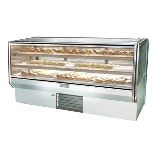 This model refrigerated bakery display case includes flush glass front, top, sides, and back held together by stainless steel moldings. This design is perfect to display inventory to guests. The stainless steel frame is industrial, sleek, and smooth in construction. The rear access sliding doors contribute to the modern design while adding efficiency and functionality.