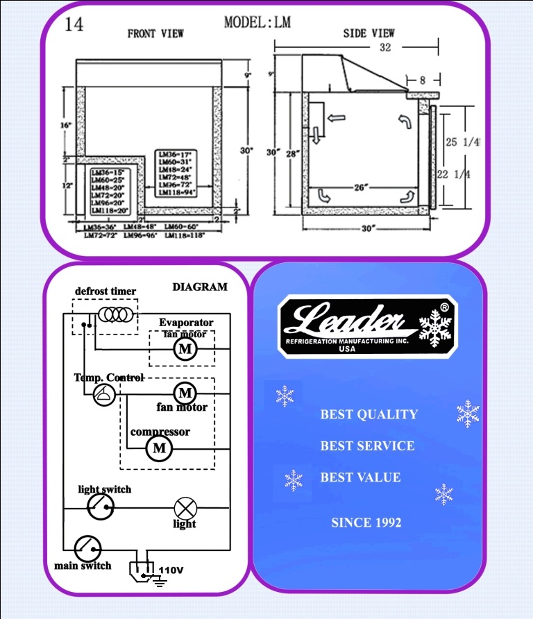 Leader MFG Sandwich Salad Prep Table 84″ [LM84SC] delivered on time as promised. Website offered excellent description of the product and works exactly as it was described. Quality of the product is superior as compared to other brands like LEADER. Item has been used for 30 days so far, hopefully it'll last forever. Sure seems like it will.