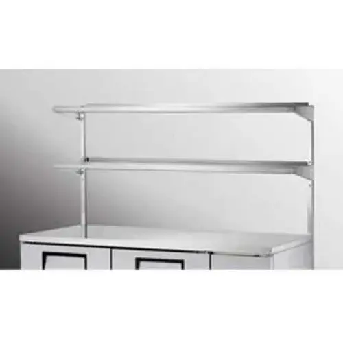 Overshelf for 60"W True standard sandwich/salad tables. Double shelf. Stainless steel. Mounting hardware included. Fixed at convenient height for easy access to commonly-used items. Channel supports underneath for sturdy storage. 16" D x 33" H. 70 lbs.