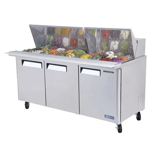 This 60.25” Sandwich & Salad Prep Table (Turbo Air MST-60) is full of great features. It has 2 swing doors, 4 shelves and boasts over 16 cubic feet of space. Stainless steel construction ensures that your kitchen looks stylish while prolonging product life. The door is ergonomically designed for your ease and features the self-closing option. An ample workspace will enhance your productivity and organization. This unit uses an "open air" approach to keep your pans cooled at a consistent temperature. This unit is a money making machine for any deli style/type business, and will prove to be a great investment.