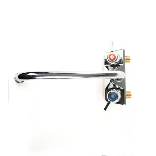 The handles on this wall mount swing spout faucet are labeled and colored for instinctual use. Blue is cold and red is hot. The design of the faucet is modern and sleek, it features a chrome plated copper construction that looks great with any sink.