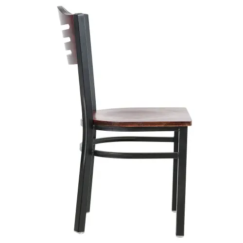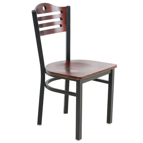 Accent the comfortable, yet classy feel of your restaurant, cafe, or bar with this contemporary mahogany bistro style dining chair from Lancaster Table & Seating. The bistro chair's seat and backrest are made of wood, which is laminated and formed for added comfort and support. A high-carbon frame made of durable, 1 1/4" steel tubing and reinforced, welded joints give the Bistro dining chair exceptional stability. The frame's baked-on, polyurethane powder coat finish is resistant to stains, scratches, and smudges. The bistro chair also comes with plastic glides to protect your floors from scuffing. 300 lb. capacity. Assembly required.