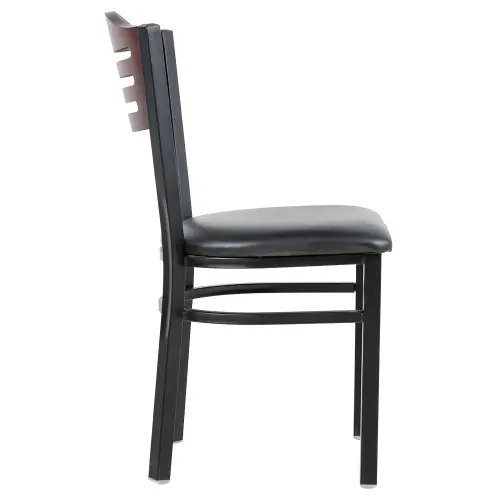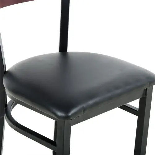 This stylish mahogany bistro chair with padded seat from Lancaster Table & Seating will enhance any decor. This chair is constructed of high-carbon, cold-rolled, 1 1/4" steel tubing and is welded at all joints. Also features a comfortable square padded vinyl seat. This heavy duty bistro chair also boasts a baked-on, polyurethane, powder coat finish that provides texture and resistance to stains, scratches, and fingerprints. The seat and back of this bistro chair are constructed of wood, and are laminated and shaped for comfort and style. Long lasting plastic floor glides help protect expensive floors. 300 lb. weight capacity. See all dining & table top supplies. See all restaurant furniture.