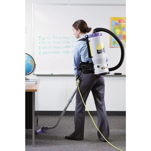 Easily clean all throughout your establishment using the ProTeam 107103 6 qt. Super QuarterVac HEPA backpack vacuum cleaner with Xover performance floor tool kit! This easy-to-transport unit weighs 10 lbs. and makes it easy to clean around and under tables, chairs, and other furniture. Its HEPA filtration feature works with ProTeam’s four level filtration system to capture up to 99.97% of airborne particles 0.3 microns or larger, ensuring you have the cleanest environment possible. This vacuum is ergonomically designed to distribute weight across the hips for comfort, and a thermal protector shut-off switch prevents the motor from overheating. It comes with a 1 1/2" diameter static-dissipating hose, 50 foot extension cord, and two Intercept Micro filters. It boasts a high-powered motor that removes more soil from carpet up to three times faster than traditional upright vacuums. Plus, an integrated tool belt keeps accessories within easy reach for maximum ease! The ProTeam 107103 Super QuarterVac HEPA requires a 120V electrical connection for operation and is CRI certified. Please consult the Specification Sheet for additional details. Xover performance floor tool kit A includes: - 14" Xover performance floor tool - 56" two piece, two bend aluminum wand with button lock - 17" crevice tool - 3" dust brush with reducer - 5" upholstery tool