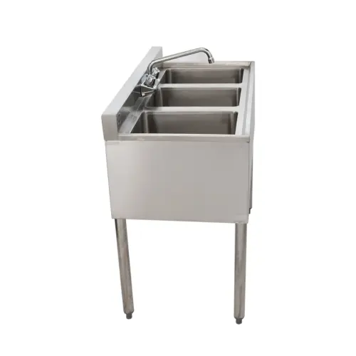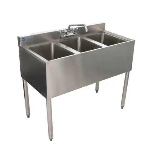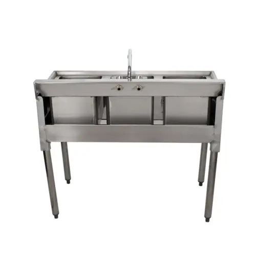 Use the Universal BS3T38 38" 3 bowl underbar sink with faucet to keep your glassware clear, clean, and fresh. This 3 compartment underbar stainless steel bar sink is durable, constructed from heavy duty stainless steel. The separate compartments keep your glassware organized and ready.