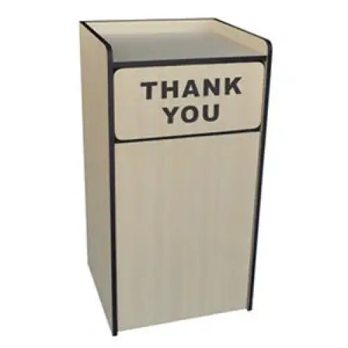 Add increased functionality and decoration to your restaurant trash receptacle with this 35 gallon trash can enclosure! The attractive wood body obscures trash from sight and helps restrict odors, while its swinging door offers a friendly "Thank You" message. Stainless steel splash guards help to keep the surrounding area clean, while a flat top gives customers a place to put trays, reducing the chance of them being accidentally discarded! This enclosure holds one square, 35 gallon trash can. It ships unassembled to give you the best shipping rate possible.