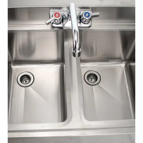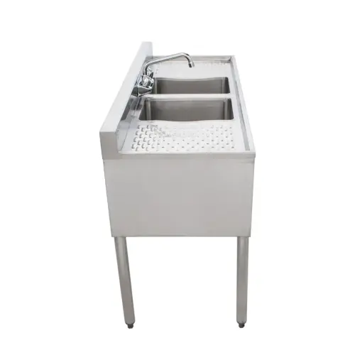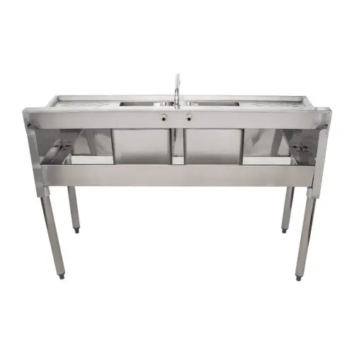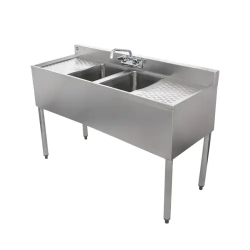 Use the Universal BS2T48-LR 48" 2 bowl underbar sink with faucet and two drainboards to keep your glassware clear, clean, and fresh. This 2 compartment underbar stainless steel bar sink is durable, constructed from heavy duty stainless steel. The separate compartments keep your glassware organized and ready. The drainboards provide a place to store dirty glasses and/or provide a place for drying them. In essence your commercial underbar sink becomes somewhat of an assembly line.