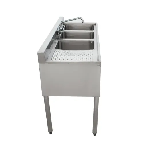 Use the Universal 48" 3 bowl underbar sink with faucet and one left drainboard to keep your glassware clear, clean, and fresh. This 3 compartment underbar stainless steel bar sink is durable, constructed from heavy duty stainless steel. The separate compartments keep your glassware organized and ready. The drainboards provide a place to store dirty glasses and/or provide a place for drying them.