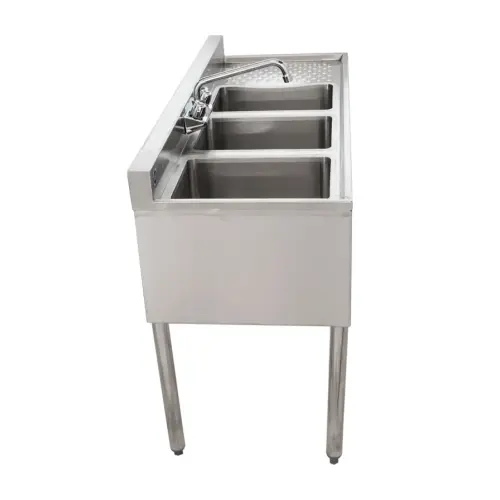 Use the Universal B3T48-R 48" 3 bowl underbar sink with faucet and one right drainboard to keep your glassware clear, clean, and fresh. This 3 compartment underbar stainless steel bar sink is durable, constructed from heavy duty stainless steel. The separate compartments keep your glassware organized and ready. The drainboards provide a place to store dirty glasses and/or provide a place for drying them.