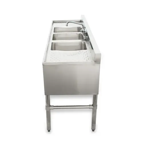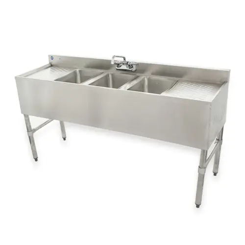 Use the Universal 60" 3 bowl underbar sink with faucet and two drainboards to keep your glassware clear, clean, and fresh. This 3 compartment underbar stainless steel bar sink is durable, constructed from heavy duty stainless steel. The separate compartments keep your glassware organized and ready. The drainboards provide a place to store dirty glasses and/or provide a place for drying them. In essence your commercial underbar sink becomes somewhat of an assembly line.