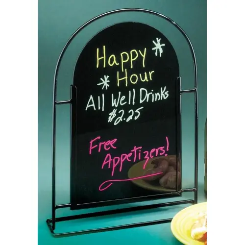 This Cal Mil 898 iron frame tabletop write on sign board combines style and functionality for a pleasant appearance when displaying your dinner specials, drink specials, upcoming events, or entertainment. A classic black wire frame provides a sturdy base for display on all of your table top surfaces. This Cal Mil 950-13 iron frame sign board measures 9"W x 15"H.