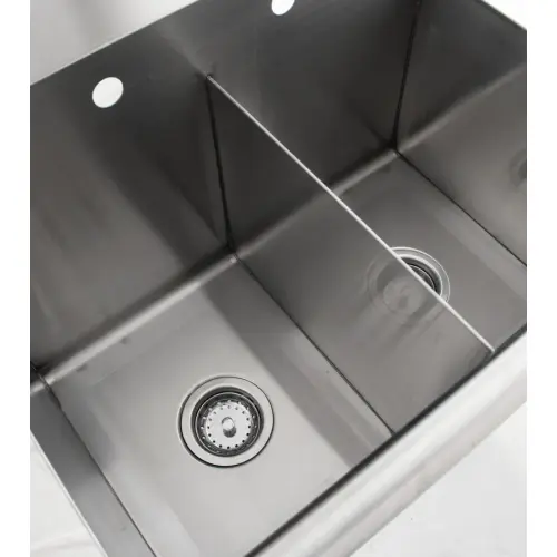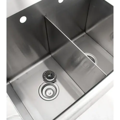 This two compartment commercial sink includes two 3 ½ inch basket strainers, one for each compartment. The basket strainers let water pass while catching all excess particles and waste.