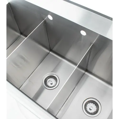 This three compartment sink includes three 3 ½ inch basket strainers, one for each compartment. The basket strainers let water pass while catching all excess particles and waste.