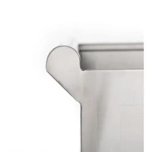 This sink includes rounded corners in the sink bowls to make usage safer. Angled bends at the bottom of the bowl make for better drainage.