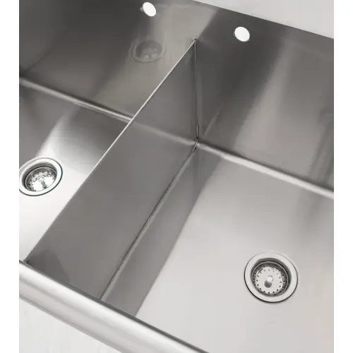This two compartment commercial sink includes two 3 ½ inch basket strainers, one for each compartment. The basket strainers let water pass while catching all excess particles and waste.