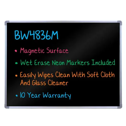 Looking to update that old, messy chalk board? This H. Wilson BW4836M wall-mounted magnetic black board is the perfect solution, featuring an ample writing area and a magnetic surface that is useful for hanging presentation materials. Great for displaying menu options or daily specials in restaurants or cafes, this black board will provide the attractive, eye-catching look of a neon sign without using electric. Also ideal for presentations, classes, or meetings, this versatile board will captivate various audiences and is the perfect visual aid for your business! This black marker board has a sturdy aluminum frame and comes with everything you need to install it on the wall, plus 4 neon markers in assorted colors to get you started! See the Instructions Sheet for installation guidance. Hardware Kit Includes: - (4) L-brackets - (4) drywall anchors - (4) long wall screws - (4) short screws