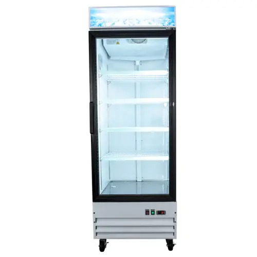 The one door glass reach in refrigerator is designed to display merchandise and provide refrigerated storage.