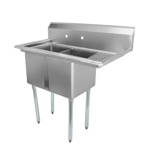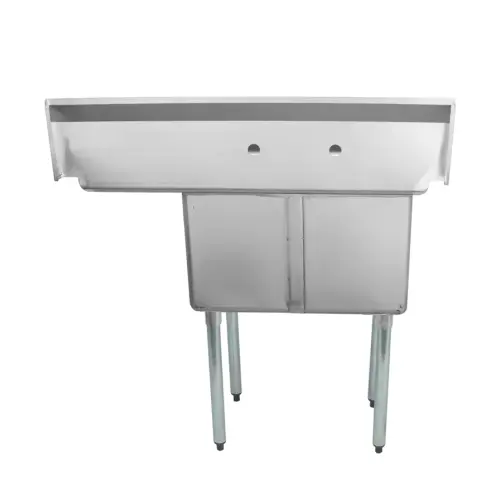 This commercial sink with two compartment includes a 12 inch x 16 inch drainboard on the right side. The drainboard is often used to place clean or ready to be cleaned dishware.