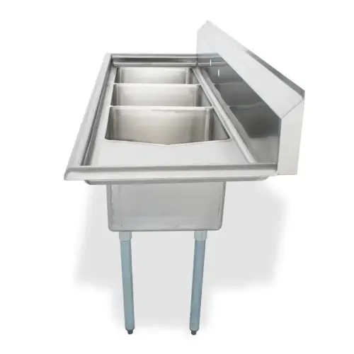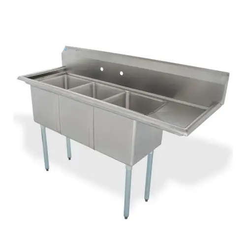 This commercial sink with three compartment includes a 14 inch x 16 inch drainboard on the right side. The drainboard is often used to place clean or ready to be cleaned dishware.