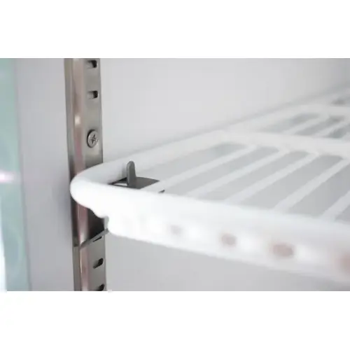Made from plastic-coated steel, the shelves in this glass door reach in freezer are easy to install and adjust. Each shelf has a 90 lb. load capacity.