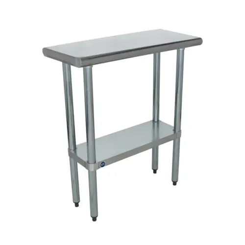 This commercial work table is a bull nose design in the front and back and a flat lip design on both sides which meets at 90° degrees. The edges are welded and grounded smooth, keeping your workplace safe.
