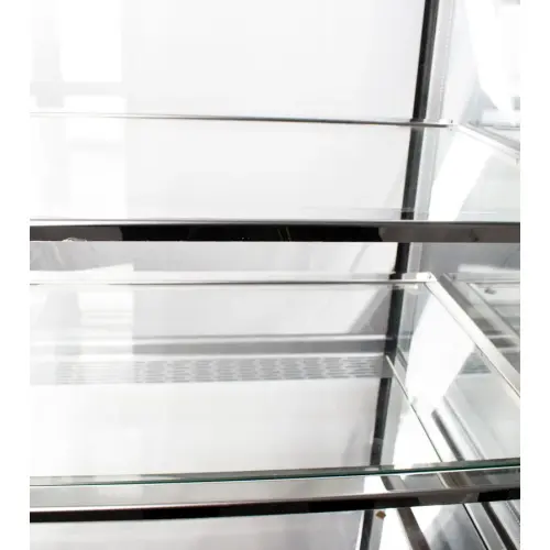 This model refrigerated bakery display case includes flush glass front, top, sides, and back. This design is perfect to display inventory to guests. The stainless steel frame is industrial, sleek, and smooth in construction. The rear access sliding doors contribute to the modern design while adding efficiency and functionality.