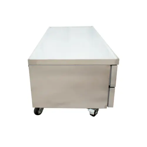 This refrigerated chef base features a 2” stainless steel top with a weight capacity of 1100 lbs. The classification table style edge helps contain spills and drips for easy cleaning.