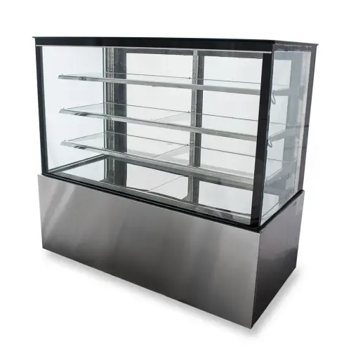 This bakery display case is made for commercial usage, it is capable of withstanding commercial and industrial daily use. The 430 stainless steel exterior is easy to clean. The flush glass design provides a sleek, durable finish.