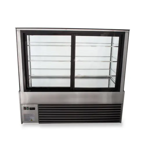 This model refrigerated bakery display case includes flush glass front, top, sides, and back. This design is perfect to display inventory to guests. The stainless steel frame is industrial, sleek, and smooth in construction. The rear access sliding doors contribute to the modern design while adding efficiency and functionality.