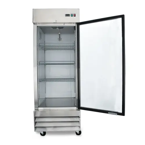 The glass door on this reach in refrigerator is self-closing with a stay-open feature. This design gives you the ability to work more efficiently and more effectively. The heavy duty door gaskets keep the cold air in, while this feature helps loading, and un-loading the reach in refrigerator easy.
