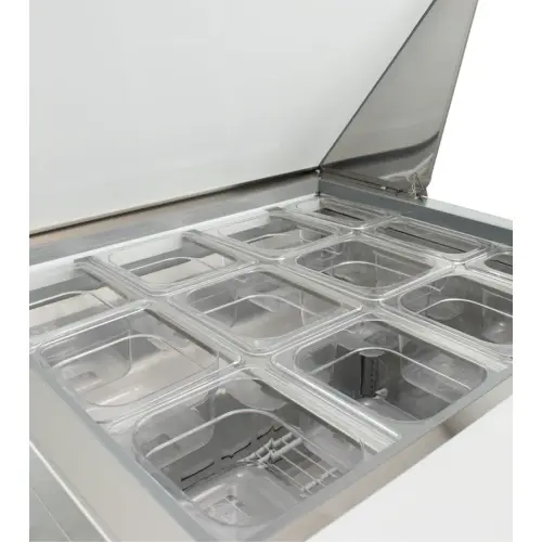 This model sandwich and salad prep table features and insulated, hinged lid which keeps in cold air during off hours. With an insulated lid you can keep toppings fresh overnight.