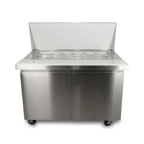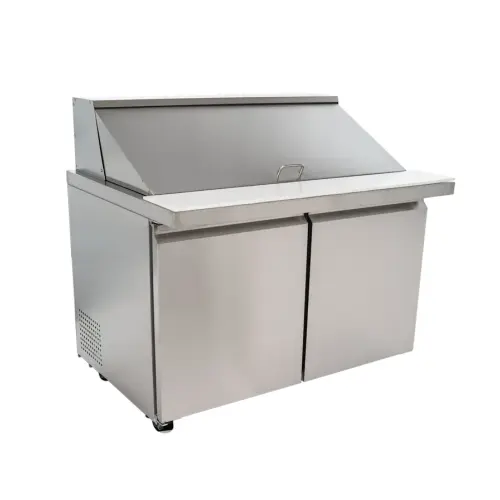 The two door 48” refrigerated sandwich prep table includes 8” deep cutting board. The smooth, durable surface is easy to clean and crack proof. The cutting board is spacious, often used to assemble sandwiches, wraps, and salads.