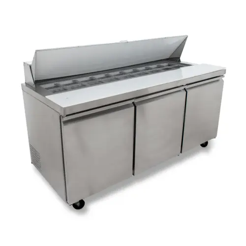 The Universal USPTR72 72” sandwich and salad prep table refrigerator provides plenty of room to assemble your culinary production. This 72” three door sandwich / salad prep table is ideal for foodservice establishments. The top design holds food pans. Generally users store vegetables, cheeses, meats, and other condiments in the food pans. This 72” three door sandwich / salad prep table includes a cutting board, you’ll have plenty of room to assemble sandwiches, wraps, and salads. The 4 built in casters makes the prep table easy to clean underneath the refrigerated prep table.