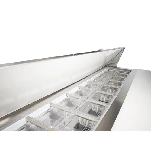 This model sandwich and salad prep table features and insulated, hinged lid which keeps in cold air during off hours. With an insulated lid you can keep toppings fresh overnight.
