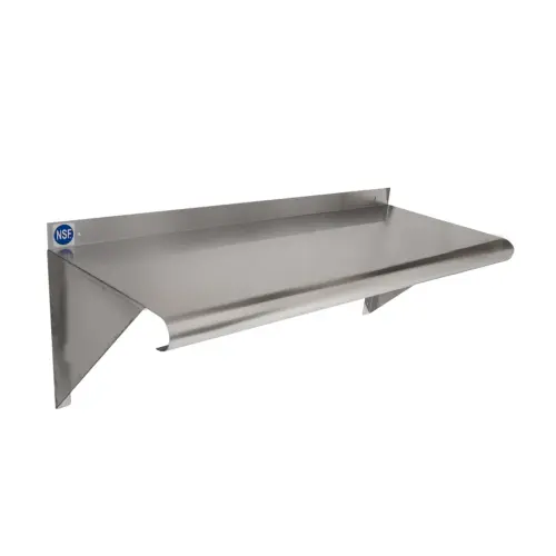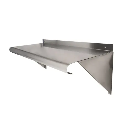 This commercial wall shelf includes 18-gauge 430 stainless steel construction with #4 finish. The matte finish eliminates glossy sheen.